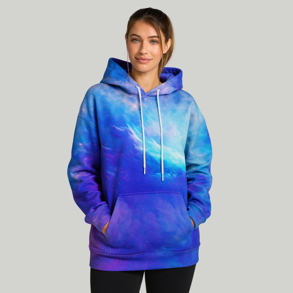 Bringing a vibrant sky-inspired design in shades of blue and purple, this pullover style hoodie features an adjustable hood and a practical front pocket. The versatile look makes it easy to pair with joggers, jeans, or casual bottoms. Available in multiple sizes, it’s suitable for everyday wear.