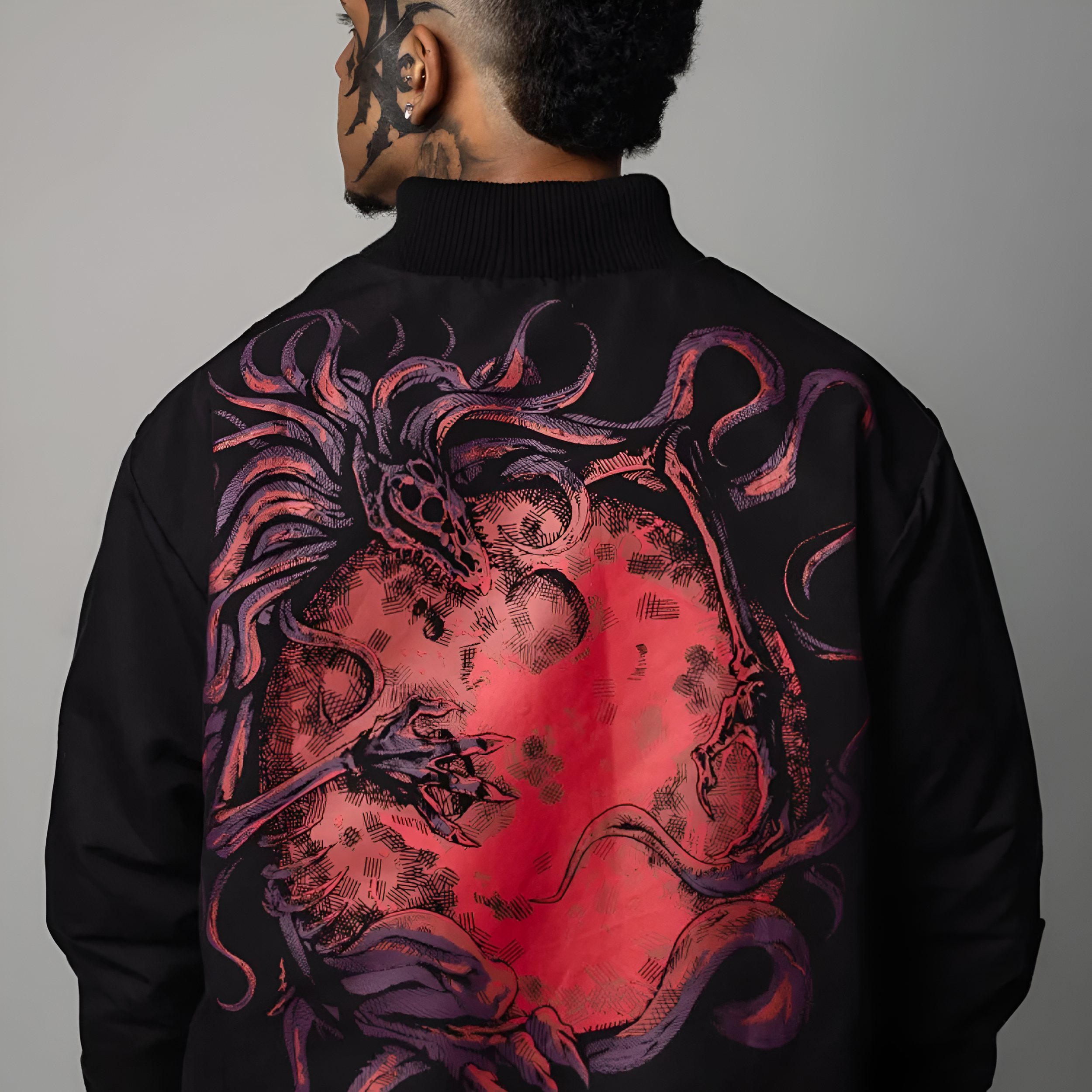 - Reversible Design for Two Looks: The Stylish Reversible Bomber Jacket With Artwork Design features a reversible design. On one side, you’ll find a vibrant full-print artwork that’s sure to grab attention. On the other, a sleek and minimal black design offers a more subtle look. This versatility means you can wear this jacket on different occasions, depending on your mood and the look you want to achieve.